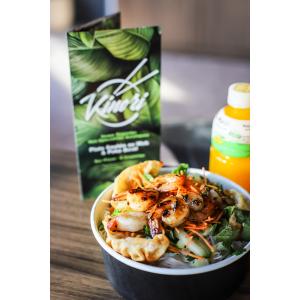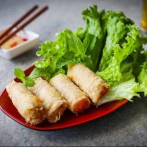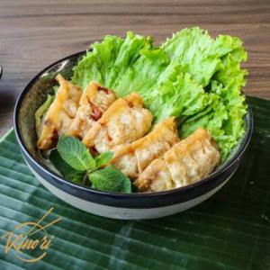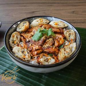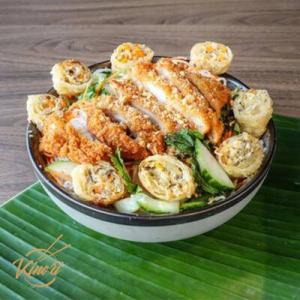 Vermicelles de riz accompagnées de poulet frit, de nems, coriandre, menthe et cacahuète