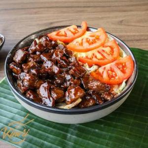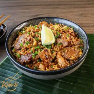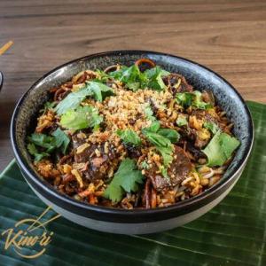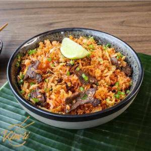 Riz sauté, huile tournesol, œuf, tomate, oignons, salade, bœuf mariné en dés, sel, poivre, ail frit