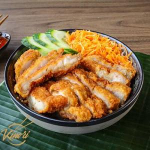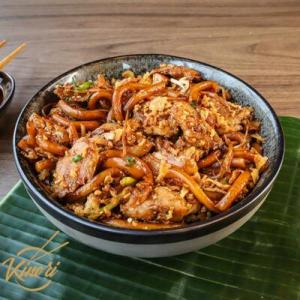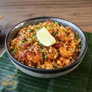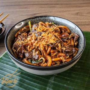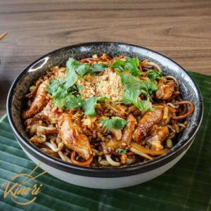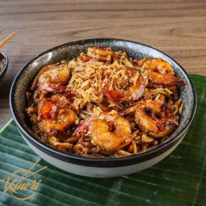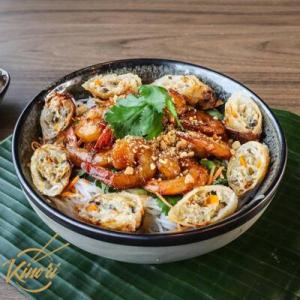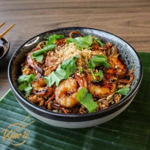 Nouille de blé, oignons, oignons frits, coriandre, soja, sauce nems et crevettes