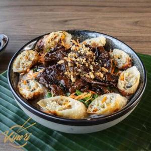 Vermicelles de riz accompagnées de boeuf, de nems, coriandre, menthe et cacahuète