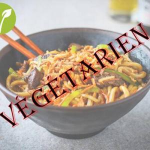 Nouilles udon de blé, carottes, oignons frits, soja, sel, poivre, crevettes